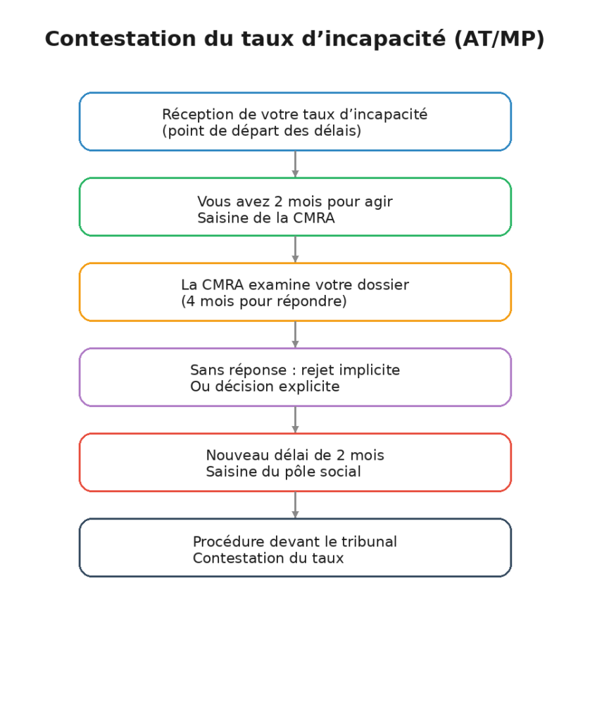 Il est donc essentiel de vérifier si le taux fixé par la caisse correspond réellement à votre état de santé, à vos limitations fonctionnelles et aux conséquences concrètes de l’accident du travail ou de la maladie professionnelle.